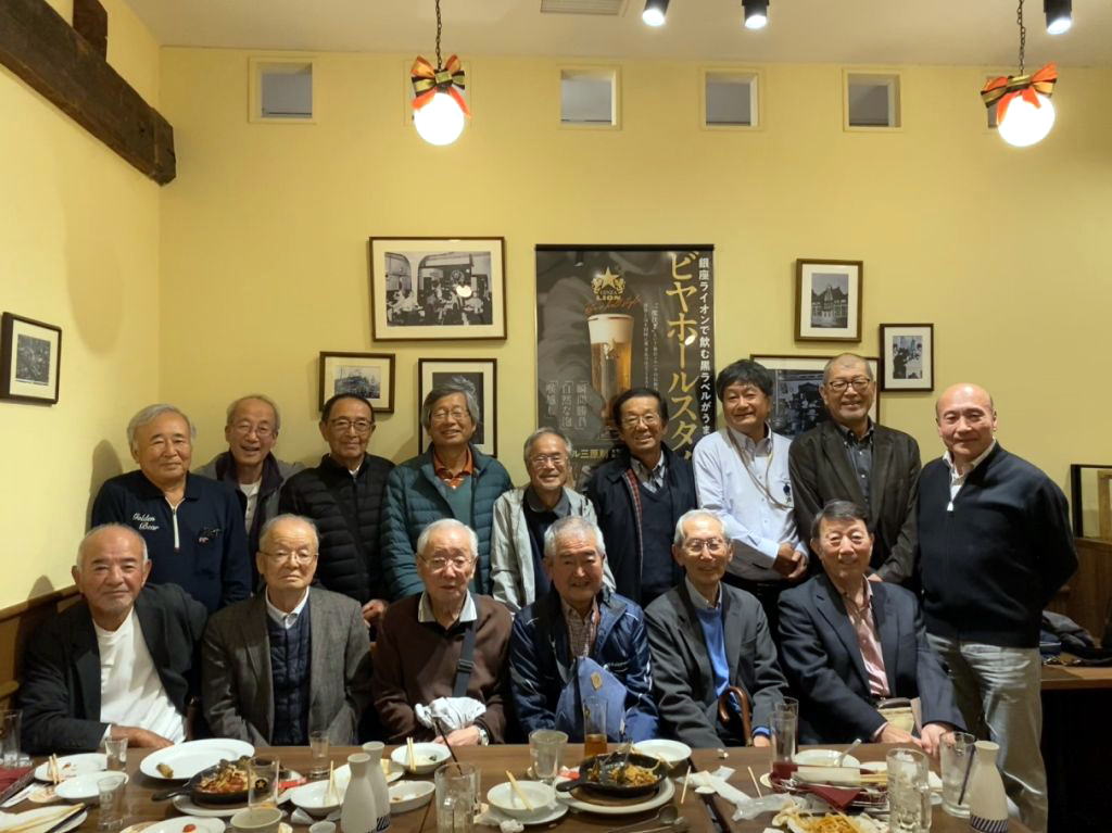 世話人代表の村松さん(15)のご挨拶、参加者最年長の田中さん(5)のご発声による乾杯で始まり、しばしの歓談の後、参加者全員から近況報告がありました。内容は体調や健康管理、趣味趣向や生活信条など多岐にわたり参考になるお話が盛沢山でした。また、五十嵐さん(6)からは「いちょう会」開催の目的と経緯、残念ながらその後他界された皆さん、体調により今回欠席された皆さんについてのご報告もございました。飲み放題のビール、焼酎、ウイスキー、冷酒の効用もあり、昔話にも花が咲き、例年にも増して盛り上がった会はあっという間に時間が過ぎてしまい、榎本さん(8)のご発声による一本締めでお開きとなりました。私自身は64歳からの参加で、まだ今年が6回目の「いちょう会の若手」ですが、昔なら恐れ多くてとても話など出来なかった先輩諸氏とも、和気あいあいと楽しませて頂けて大変有難く思っております。併せて、この様な懇親会や各種企画を工夫継続しながら、OB会活動を活性化されて来られた大先輩の皆様に頭が下がる思いです。最後に、今年もまた開催案内の出状と取りまとめ、当日の受付と司会進行の労をお取り頂いた浦田さん(18)に改めてお礼を申し上げたいと思います。本当に有難うございました。